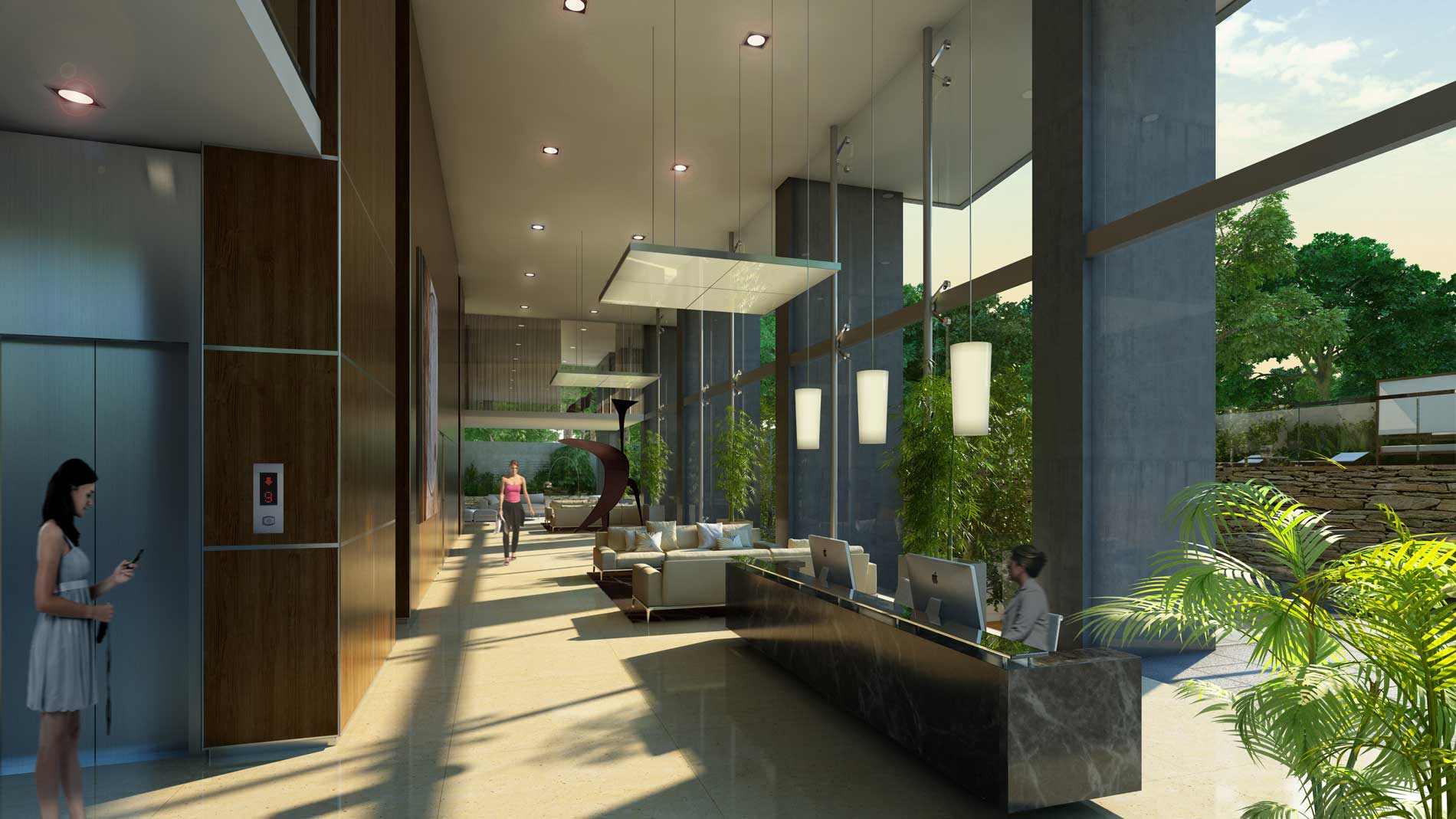 Lobby de entrada de doble altura con frente vidriado, doble puerta de acceso, piso de mármol o granito natural y revestimiento de espejo y/o madera y acero inoxidable.
