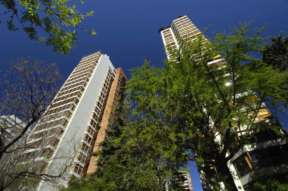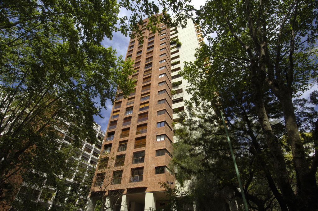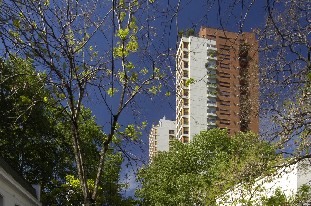 Este caso se basó en tres premisas básicas que han sido luego constantes en los distintos Conjuntos: 1. Mantener la valiosa arboleda existente, 2. Utilizar gran cantidad de la superficie del terreno para el esparcimiento de los ocupantes del conjunto proyectado, y 3. Diseñar dos edificios con distintas dimensiones de planta para adecuarlos a diversos requerimientos manteniendo igual calidad respecto de su equipamiento y terminaciones. En las plantas tipo puede verse claramente como alrededor del núcleo central de circulación vertical se articulan las tres zonas clásicas de éste tipo de viviendas: recepción – estar, descanso y servicio.