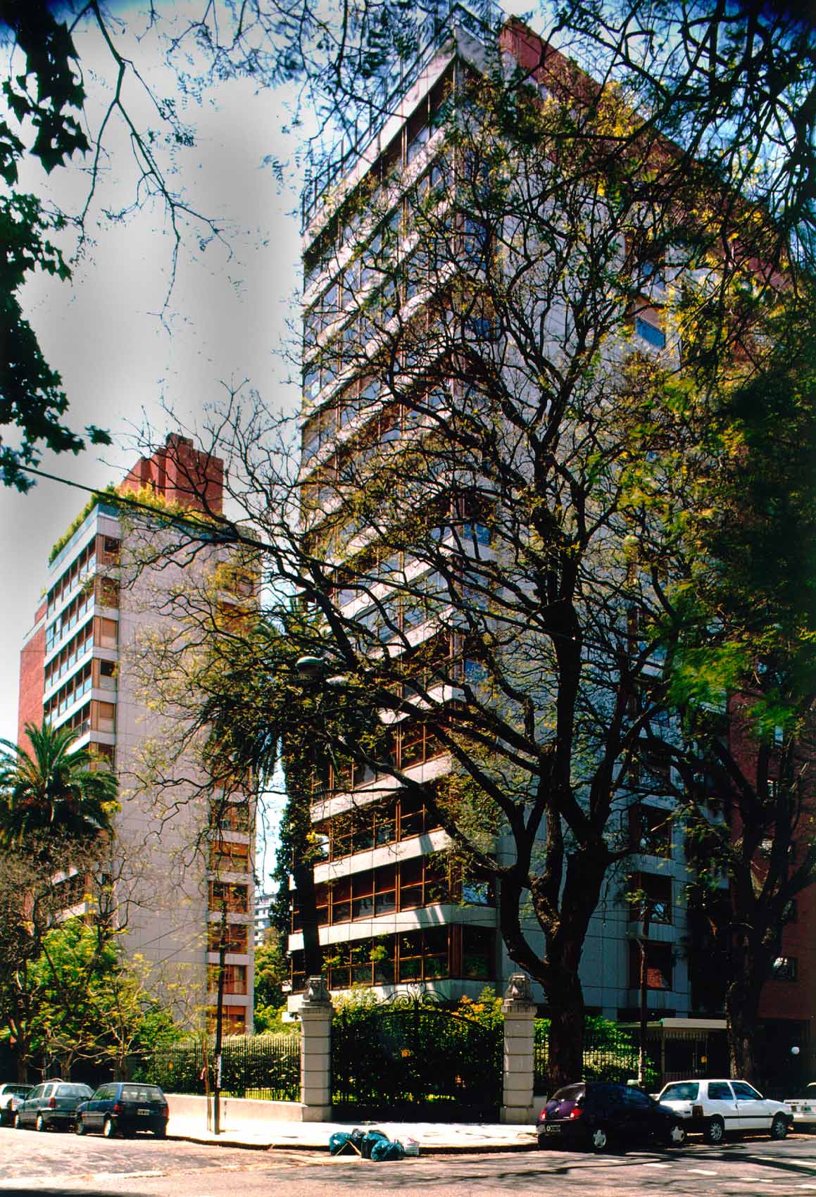 Los edificios, construidos exteriormente en ladrillo visto y hormigón armado visto, tienen balcones con cerramiento de madera natural que, en conjunto con una equilibrada planta alargada tienen la calidez y la calidad de vivienda individual que configuró una imagen característica de los edificios de departamentos construidos por el Estudio, originariamente en el barrio de Belgrano y luego en diversas zonas de Buenos Aires, durante los años 70 y 80. Los dos subsuelos para cocheras, bauleras, porterías y locales auxiliares comunes, saunas con relax, vestuarios y sanitarios, se construyeron con un gran esfuerzo de proyecto para dejar el terreno natural necesario a los fines de mantener la mayor parte de la arboleda existente. Las torres, bajas y muy integradas a la forestación existente, son de 12 pisos típicos y dos dúplex, conformando unidades de gran lujo de 280 m2 una y 350 m2 propios la otra, con dúplex de 400 y 600 m2 respectivamente.