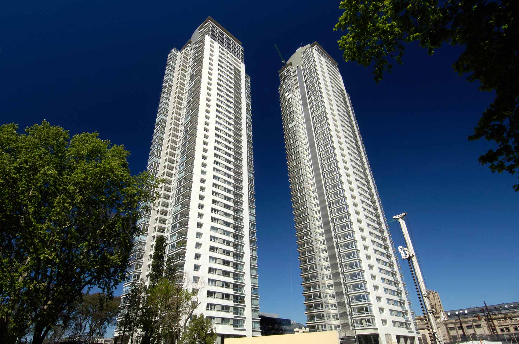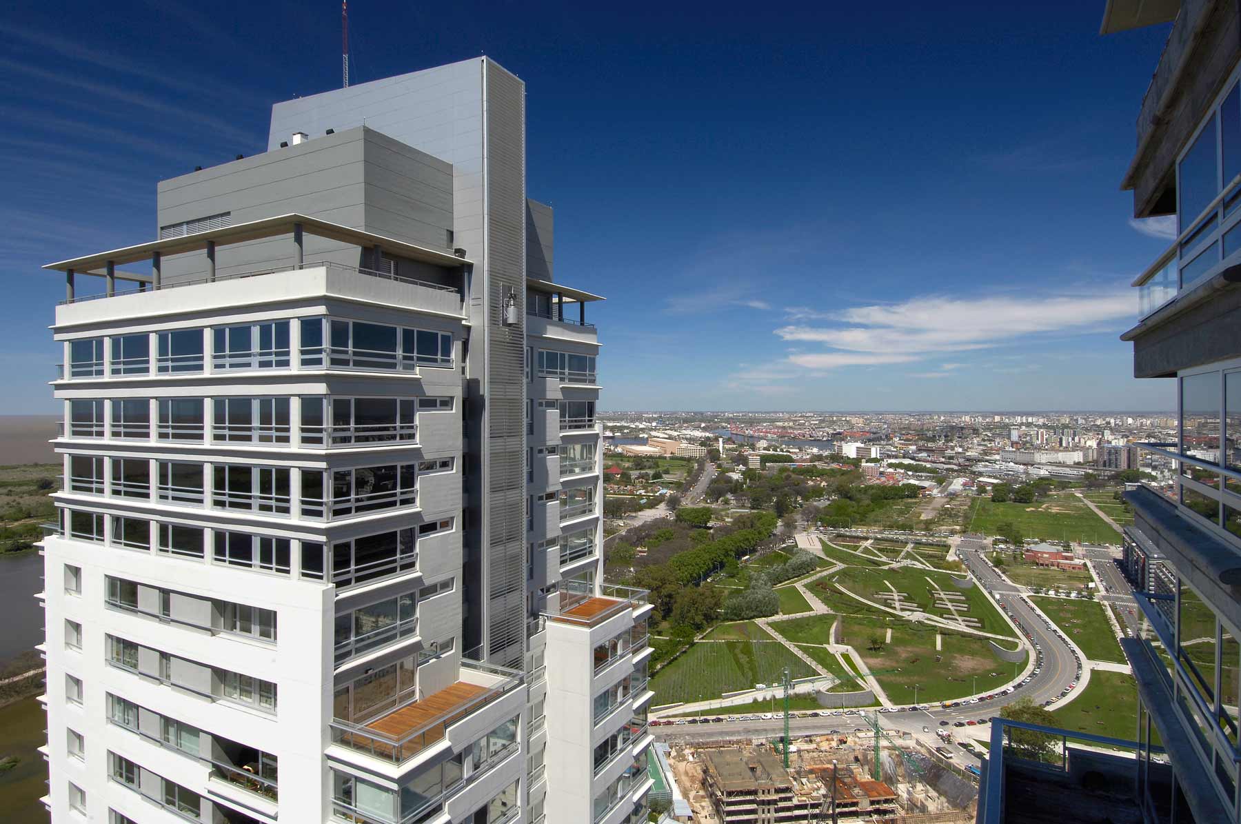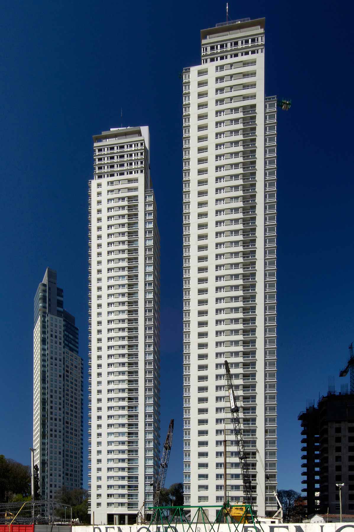 Allí donde el master-plan para el área surgido del Concurso público preveía la construcción de «racimos de torres» hemos proyectado un conjunto integrado por tres esbeltos edificios de departamentos con servicios independientes para cada uno. Las tres torres, de bordes curvos y grandes terrazas sobre el Río y la Ciudad, están agrupadas en torno a una gran plaza de accesos y apoyadas sobre un extenso parque que se extiende sobre la totalidad del predio.