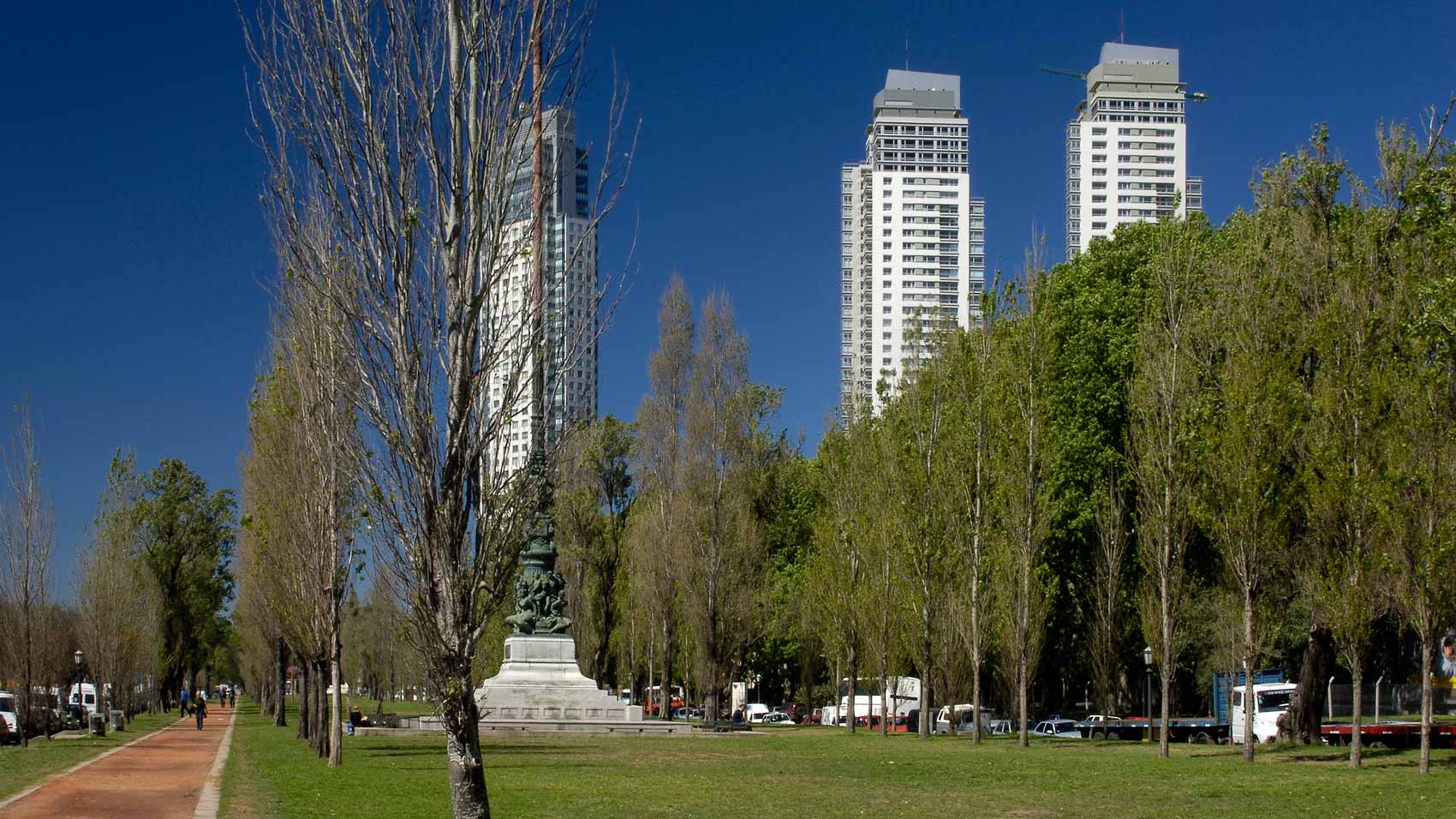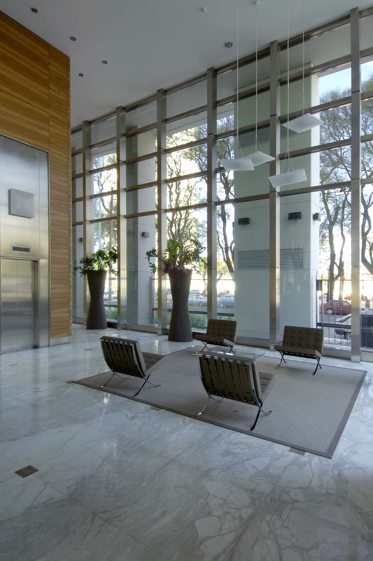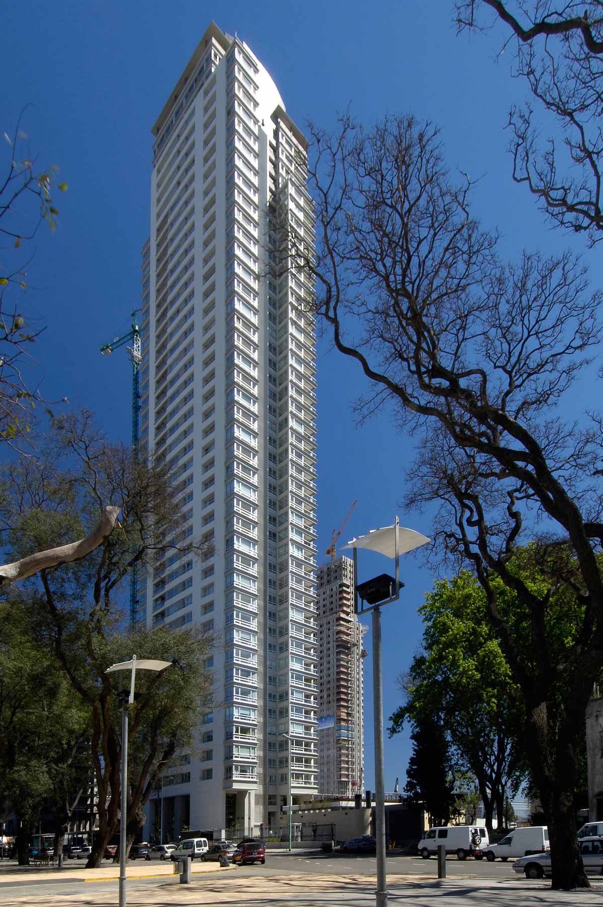 Allí donde el master-plan para el área surgido del Concurso público preveía la construcción de «racimos de torres» hemos proyectado un conjunto integrado por tres esbeltos edificios de departamentos con servicios independientes para cada uno. Las tres torres, de bordes curvos y grandes terrazas sobre el Río y la Ciudad, están agrupadas en torno a una gran plaza de accesos y apoyadas sobre un extenso parque que se extiende sobre la totalidad del predio.