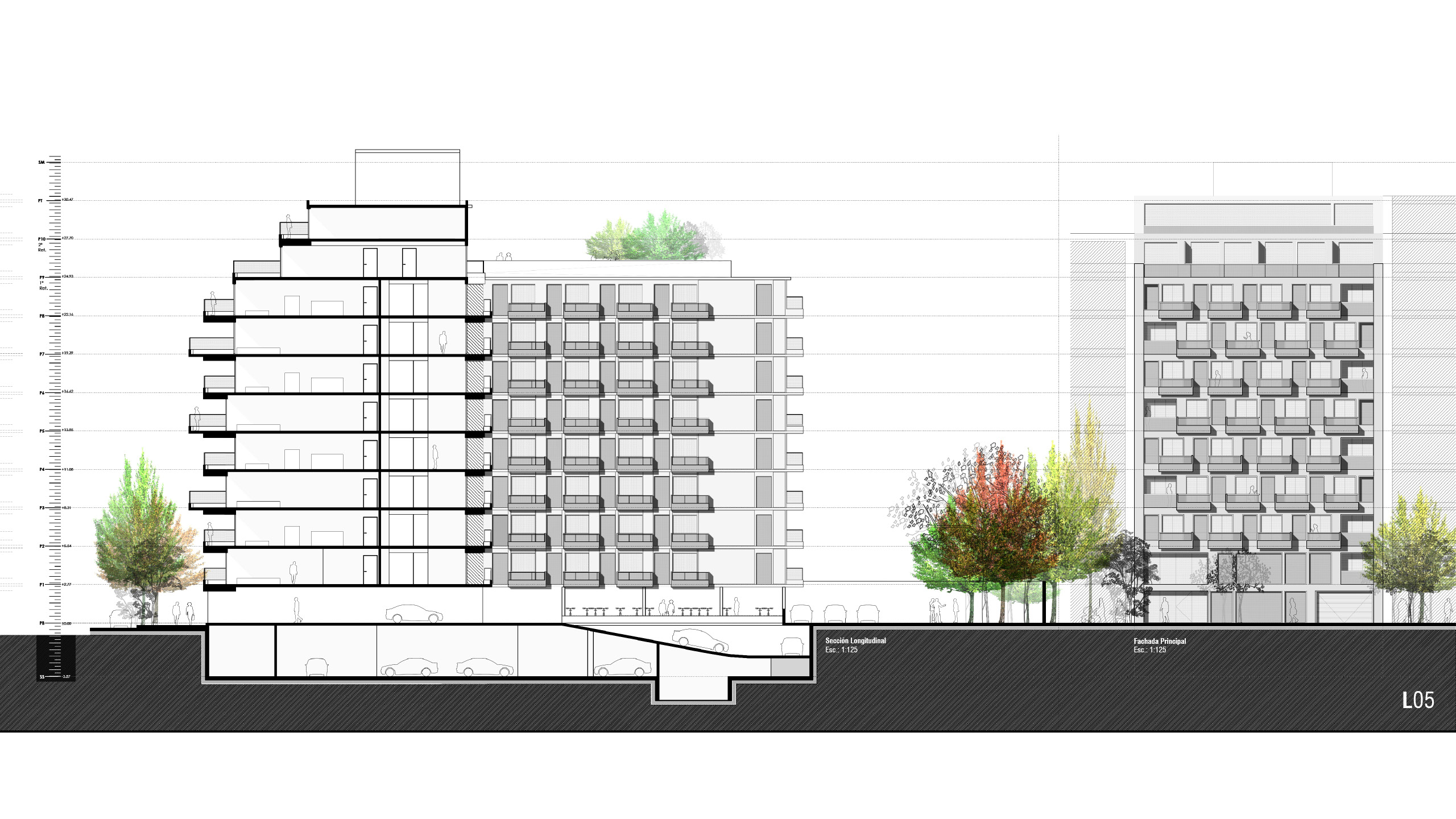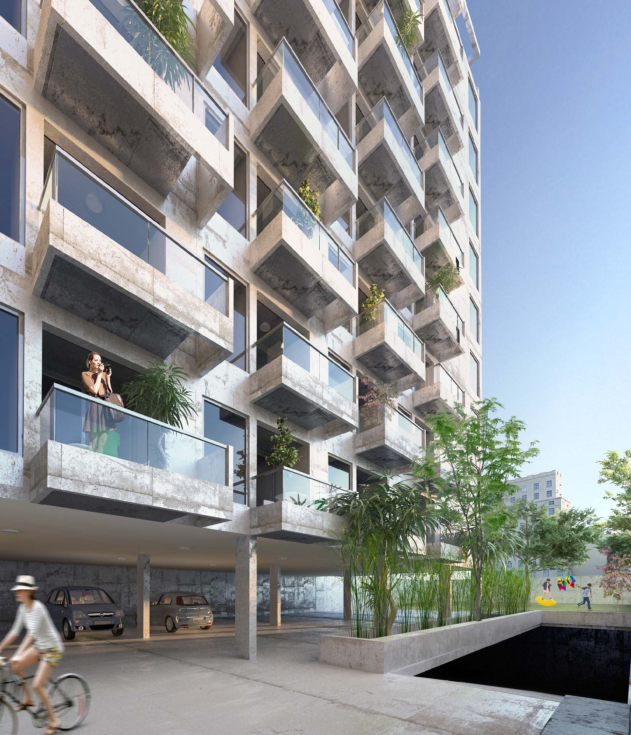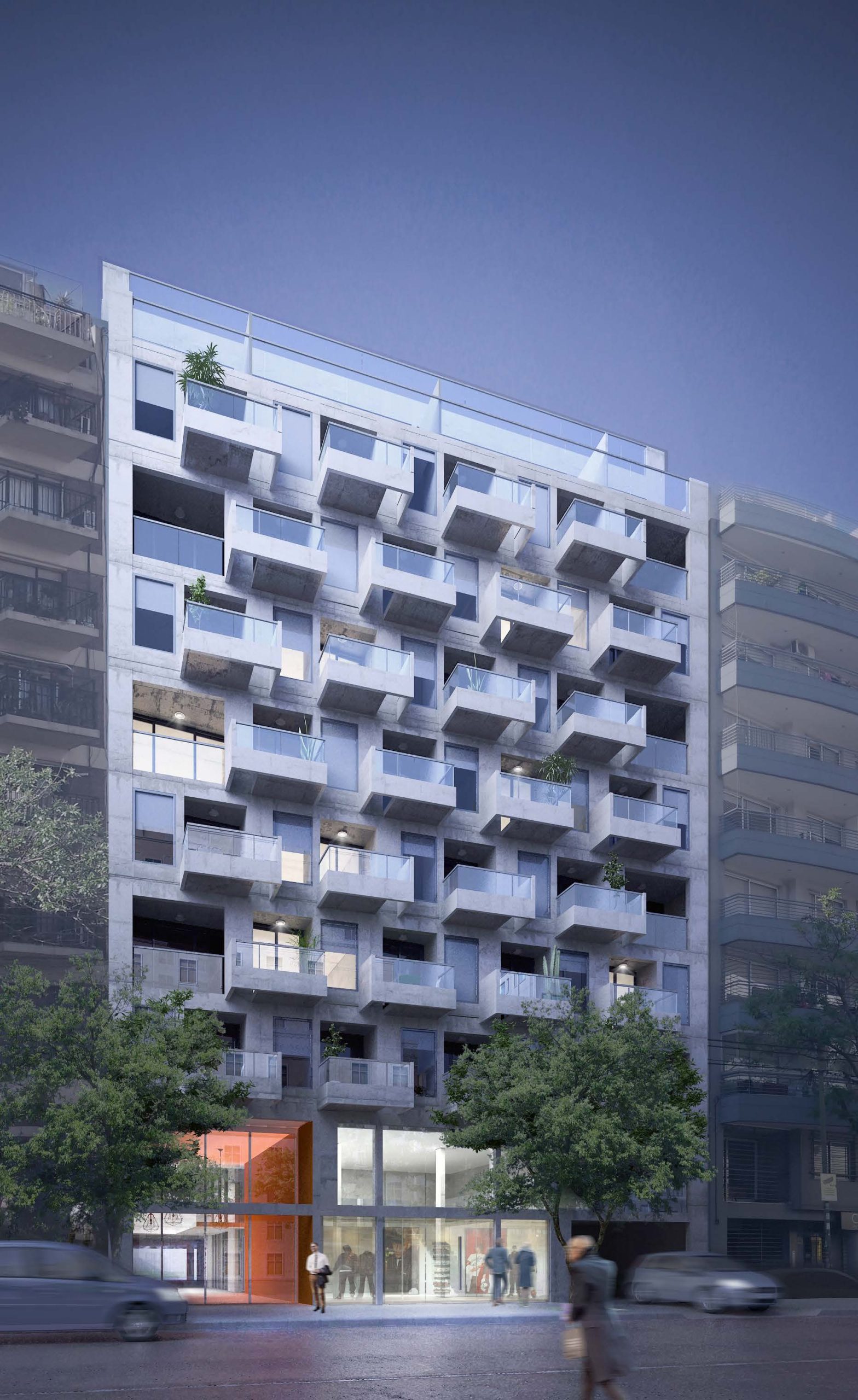 La fachada diseñada obedece a la intención de conferir identidad a cada una de las unidades, expresando cada balcón terraza como un elemento autónomo, donde el conjunto se enrasa con edificios existentes, logrando uniformidad urbana hacia la ciudad.
