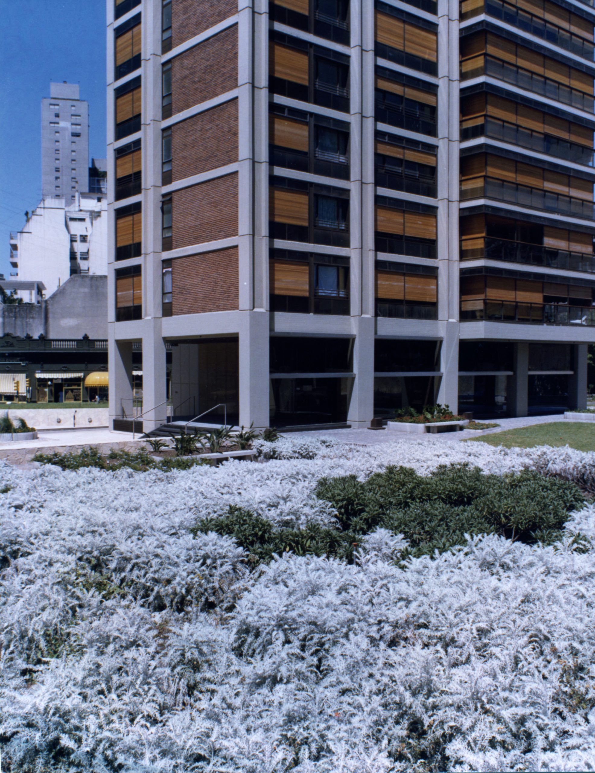 El exterior de las torres, considerado especialmente en este proyecto por sus dimensiones y sus proyecciones urbanísticas, fue diseñado por el paisajista brasileño Roberto Burle Marx. Los jardines configuran un enorme y rico tapiz de formas curvas de gran libertad de diseño, tejido con elementos naturales que puede ser utilizado como solario en torno de las piscinas o como plazoletas en el sector frente al hall de entrada. La relación con el entorno inmediato, a través de un talud de piedra que produce una pequeña diferencia de nivel ha resultado de gran amabilidad urbana.